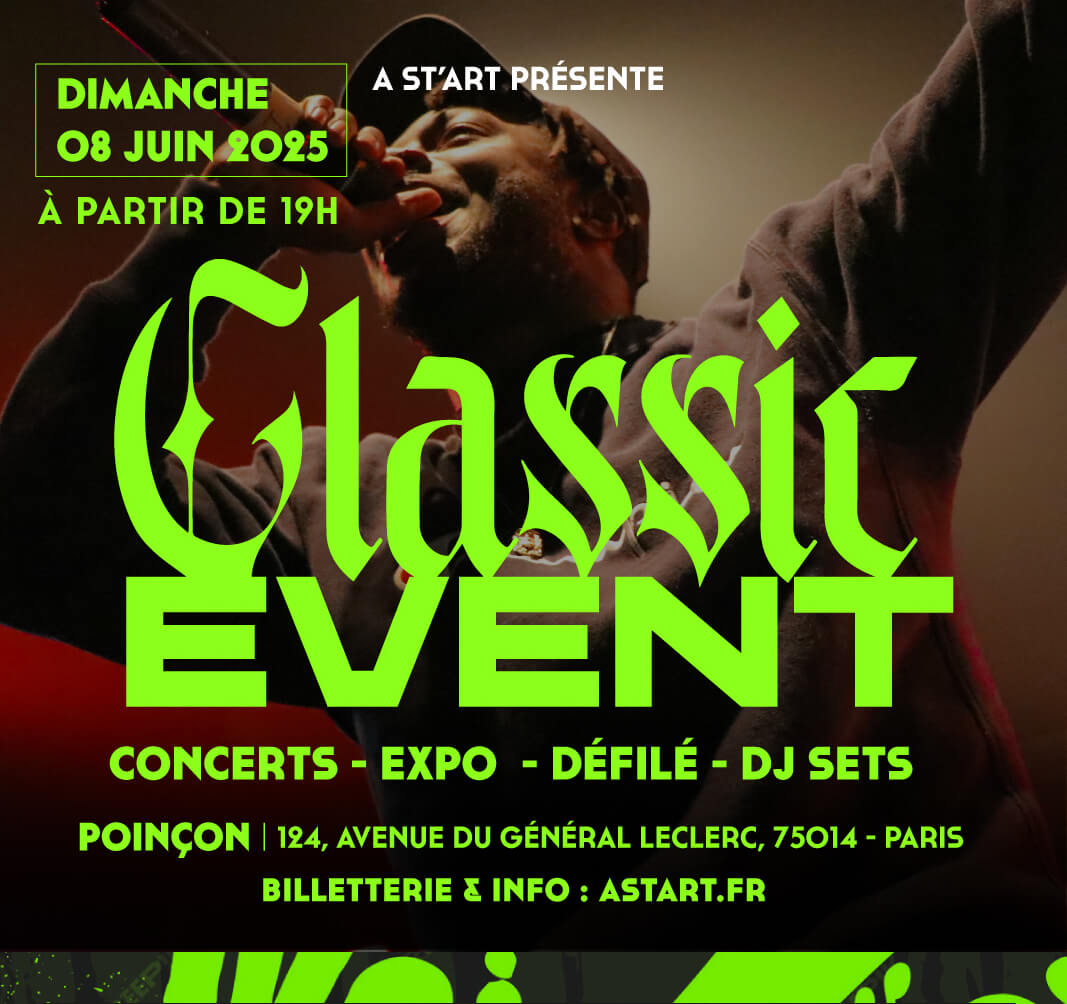 Organisé par A St’Art, structure engagée dans la valorisation des cultures urbaines et l’accompagnement des artistes émergents, CLASSIC EVENT incarne une vision forte : celle d’un hip-hop accessible, pluriel et résolument tourné vers l’avenir.