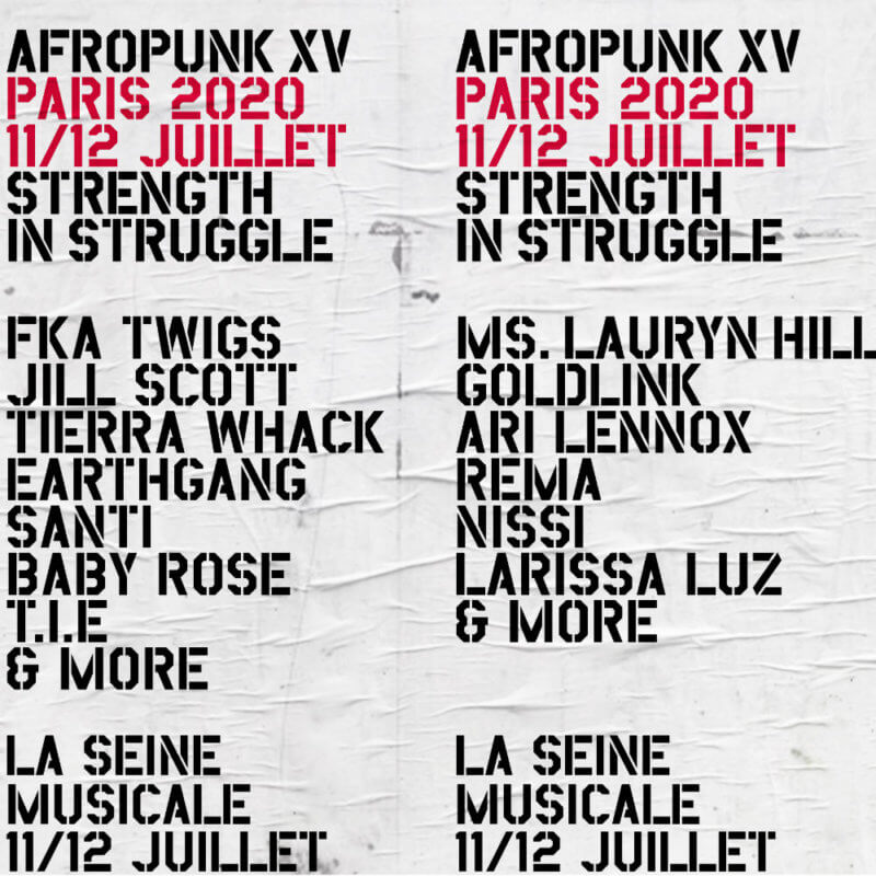 2020 est une année spéciale pour AFROPUNK : elle marquera le 5ème anniversaire d’Afropunk Paris mais aussi le 15ème d’Afropunk au niveau mondial. Et la programmation d’AFROPUNK Paris est à la hauteur de l’événement : Ms. Lauryn Hill, FKA Twigs, Jill Scott, Goldlink, Tierra Whack, Ari Lennox, EarthGang, Rema, Santi, Nissi, Baby Rose, Larissa Luz et T.I.E. sont les premiers artistes confirmés à AFROPUNK PARIS.